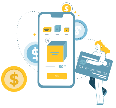 Representación de funcionalidades de Yuju ilustradas por una mujer con una tarjeta de crédito con un celular al lado y monedas